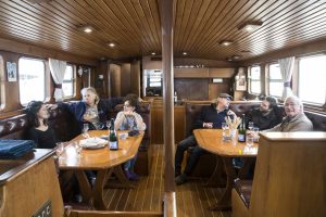 Toute la vie du bord se déroule sur le pont ou dans le grand carré confortable avec « vue sur mer ». Ainsi, à n’importe quel moment de la journée, et quelques soient les conditions météorologiques, vous ne perdez pas une miette du spectacle. Par ailleurs, l’ensemble du bateau est chauffé permettant de naviguer toute l’année et sous toutes les latitudes.
