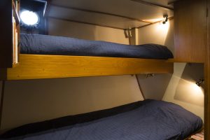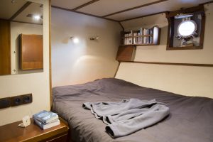 Le navire accueille 9 à 10 passagers et 2 à 3 membres d’équipage, selon les programmes et les destinations. Les cabines se situent toutes sur le pont inférieur, favorisant ainsi tranquillité et intimité. Elles sont équipées de nombreux rangements et de hublots occultant.